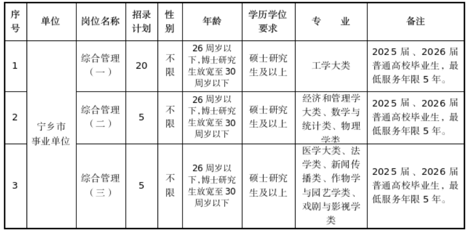 一 引进范围对象、原则及条件 (一)引进范围和对象 普通高校2025届、2026届硕士研究生及以上学历学位毕业生。具体引进岗位、专业及学历学位要求详见公开引进选拔生岗位计划表。 (二)引进原则 1.坚持德才兼备的用人标准。 2.坚持公开、平等、竞争、择优的原则。 3.坚持工作需要、人岗相适,注重综合能力和专业知识相结合。 (三)引进岗位资格条件 1.引进基本条件: (1)具有中华人民共和国国籍,遵守中华人民共和国宪法和法律; (2)政治素质好,思想品德优,志愿从事基层建设事业并有较强的基层工作适应能力,无违法违纪行为和不良记录; (3)学习能力强、成绩优,具备良好的职业素养和敬业精神,有较强的综合分析、组织协调、语言表达和解决实际问题能力,有志于从事党政管理工作; (4)具备岗位所需的学历学位以及其他条件。 2.有下列情形之一的人员,不得报名参加本次公开引进: (1)曾因犯罪受过刑事处罚的人员; (2)曾被开除中国共产党党籍或被开除公职的人员; (3)尚未解除党纪、政纪处分或正在接受纪律审查的人员; (4)涉嫌违法犯罪正在接受司法调查尚未作出结论的人员; (5)在各级各类事业单位公开招聘中因违反《事业单位公开招聘违纪违规行为处理规定》被记入事业单位公开招聘应聘人员诚信档案库,且记录期限未满的人员; (6)被依法列为失信联合惩戒对象的人员; (7)在读的计划内统招非2026届毕业生(博士研究生不能以硕士研究生学历报考); (8)宁乡市内在编人员; (9)公务员和参照公务员法管理的人员未满最低服务年限,事业单位正式在编工作人员尚在最低服务年限内且未获得所在单位及主管部门同意的; (10)在2025年宁乡市公务员考录、事业编制人员招聘和选拔生引进环节(体检、考察、公示)中放弃资格的人员; (11)法律、政策规定不得聘用为事业单位工作人员的其他情形。 二 引进岗位、计划及具体条件 公开引进选拔生岗位计划表 1.硕士研究生26周岁以下是指1999年9月1日以后出生,博士研究生30周岁以下是指1995年9月1日以后出生。 2.报考人员的学历(学位)必须为国家认可的学历(学位),对有疑义的国民教育学历(学位),以省级以上教育行政部门认定的结果为准。国(境)外留学的报考人员所取得的学历(学位)经教育部认证后可视同为相同等级国内计划内统招学历。 3.国内、国(境)外高校2025届、2026届毕业的硕士研究生、博士研究生,须在2025年1月1日至2026年7月31日期间取得相应学历学位证书;国(境)外高校毕业的硕士研究生、博士研究生须同时于2026年9月30日前取得教育部留学服务中心相应国(境)外学历学位认证。2026届全国普通高校毕业生可暂凭加盖毕业院校就业部门印章的就业推荐表原件报名、参加资格审核。 上述引进对象均需符合报考岗位所需的学历和岗位要求,未在规定时间取得相应学历学位证书或认证书的不予聘用。上述时间以学历学位证书或认证书的落款时间为准。 三 引进程序及办法 采取发布信息、网上报名、资格初审、综合能力评价、资格复审、考核、体检、考察、公示、办理相关人事手续的方式进行。 (一)发布信息 公告及有关公开引进具体安排、各环节相关信息等均在宁乡人才网(www.nxxhr.cn)公布,请报考人员自行查阅,不另行通知。 (二)网上报名 1.本次公开引进采取网络报名方式进行,不设现场报名。 2.报名时间为2026年1月12日9:00至1月26日17:00。 3.报名方式: 手机端:扫描或长按识别“宁乡人才”微信公众号二维码(见附件1),关注“宁乡人才”微信公众平台,点击“才服务”—“考试报名”,应用微信小程序报名。 计算机端:登录宁乡人才网(http://www.nxxhr.cn)网站报名,报考人员在“宁乡人才网”首页进入网上报名系统。按如下要求进行报名: (1)真实、准确、规范填写报名表; (2)上传个人近期清晰免冠寸照至表格指定区域; (3)上传有效居民身份证的正反面照片; (4)上传对应岗位要求的毕业证、学位证(国外留学需提供教育部认证书)原件照片; (5)2026届毕业生报考,应提交加盖毕业院校就业部门印章的就业推荐表清晰扫描件。 4.岗位所要求的专业参照《湖南省2025年考试录用公务员专业指导目录》(见附件2),报考人员的专业应严格按照毕业证书填写。报考人员所学专业未列入《湖南省2025年考试录用公务员专业指导目录》的,由中共宁乡市委组织部、宁乡市人力资源和社会保障局根据相关材料进行认定。 5.报考人员必须先在报考系统完成实名认证,未通过实名认证的考生,其报考信息不被系统接受。 6.报名时,报考人员须同意诚信承诺书,必须符合所报岗位的条件要求,如实填写本人相关信息,并保证信息的完整、合法、真实、准确。报考人员和有关单位、人员提供的涉及报考资格的材料或信息不实的,取消本次报考资格;报考人员恶意注册报名信息,扰乱报名秩序或者伪造学历(学位)证书及其他有关证件、证明材料的,取消报考资格,并按有关规定进行处理,由此造成的一切损失由报考者本人承担。 7.报考信息一经提交,即自动流转进入资格审查环节,报考信息将无法进行修改。 8.各岗位有效报名人数与引进计划数的比例须达到6:1(含6:1)方可开考,达不到此比例则取消或核减该岗位引进计划数。 (三)资格初审 1.采取网上审查的形式,资格初审时间为2026年1月12日13:00至1月27日12:00。请考生在2026年1月27日11:00前注意及时查询本人资格的初